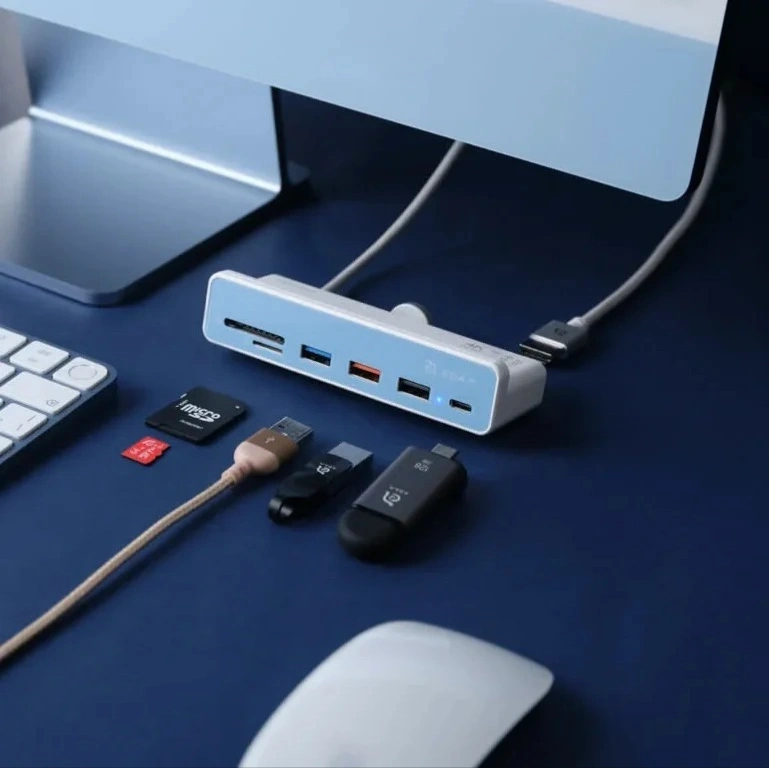 The CASA Hub i7 is a color-matching 7-in-1 USB-C hub designed specifically for the iMac 24" (2021). Effortlessly install it using its twist-and-clamp system—no tools needed—and keep your desk tidy with 6 front-facing ports: three USB-A (including one 7.5 W charging port), one USB-C, SD and microSD slots for fast file access. A hidden HDMI port at the rear supports crisp 4K@60 Hz output (DP 1.4, HDCP 2.2). The soft-touch finish protects your iMac, while the plug-and-play design ensures effortless setup. Includes seven interchangeable faceplates to perfectly match your iMac’s color.