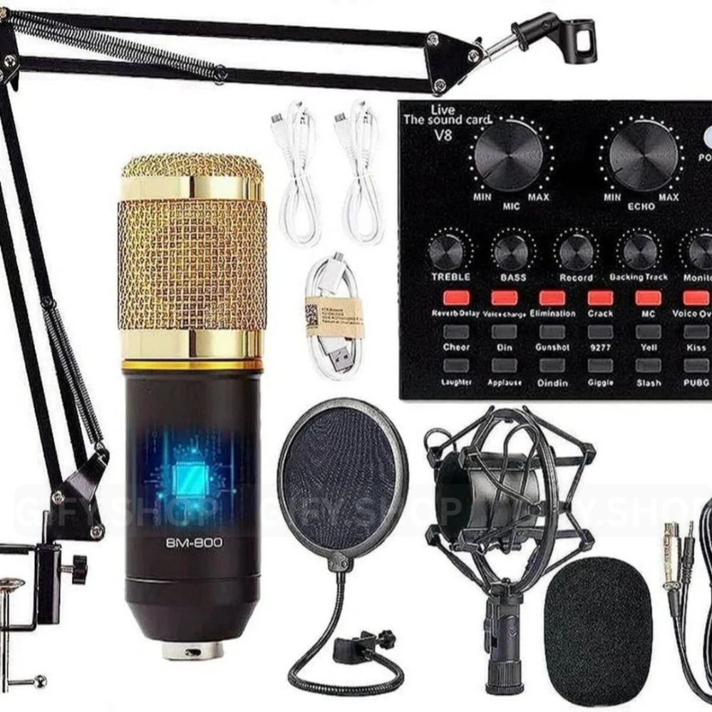 Elevate your studio setup with the BM-800 Mic Kit plus Live Sound Card bundle – perfect for recording, streaming, podcasting or voice work. Includes the BM-800 cardioid condenser mic (20-20k Hz response, low self-noise ~16 dB(A), high SPL tolerance), plus boom scissor arm with adjustable suspension, shock mount, pop filter and foam cover to reduce unwanted noise. The included live sound card gives you control of echo, voice-effects, bass/treble, and pre-set modes so you can instantly shape your sound. Compatible with PC, laptop, and many smartphones. Available now at Rozai in Kathmandu, delivered across Nepal.