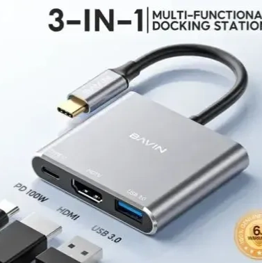 he BAVIN OTG55 is a compact 3-in-1 USB-C hub that upgrades a single Type-C port into a versatile connectivity solution. It features a 4K HDMI output (3840×2160@30Hz) for connecting your laptop or tablet to an external monitor, HDTV, or projector — perfect for presentations, movies, or multitasking on a larger screen. A high-speed USB 3.0 port allows quick data transfer from drives, peripherals, or external storage. Meanwhile, the built-in USB-C PD port delivers up to 100 W of power delivery, letting you keep devices charged — even while outputting video or transferring data. Lightweight and plug-and-play, the hub is widely compatible with USB-C laptops, tablets, and smartphones, making it a handy travel accessory or desktop enhancement.