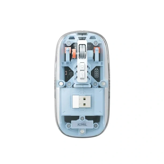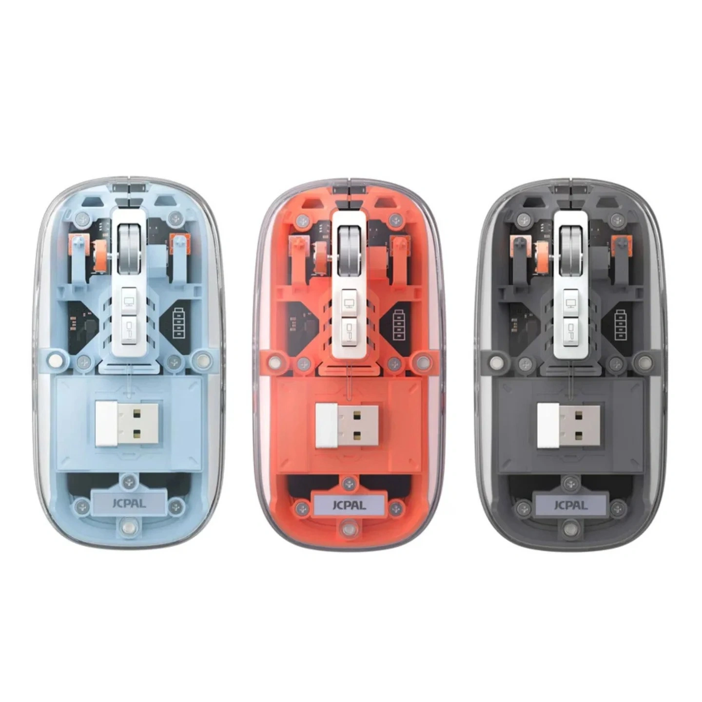 The JCPAL Ctrl Pro Wireless Optical Mouse is a sleek, high-performance wireless mouse designed for flexibility, convenience, and style. Its standout feature is a transparent, magnetically attached top cover that not only showcases the internal design but also provides quick access to the USB receiver. Offering both Bluetooth and 2.4 GHz wireless connectivity, it allows seamless control across up to three devices — perfect for users who switch between laptops, tablets, or desktops.