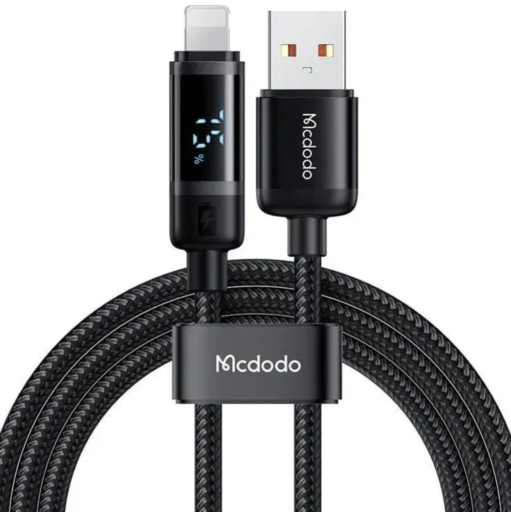 The CA-5000 from Mcdodo is a 1.2‑meter USB‑A to Lightning data cable designed for iPhones and other Lightning‑port devices. It delivers up to 3 A charging for fast power‑up, and its standout feature is a built‑in digital display that shows the real‑time battery or charging status — letting you monitor battery level at a glance. The cable is built with a robust aluminum‑alloy housing and a nylon‑braided exterior for enhanced durability and bending resistance. Beyond charging, the cable also supports stable data synchronization, making it suitable for both charging and file transfer.