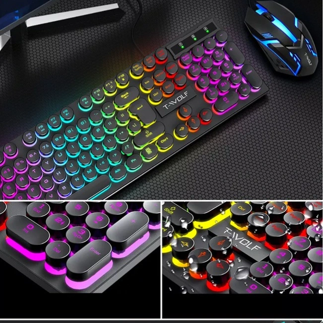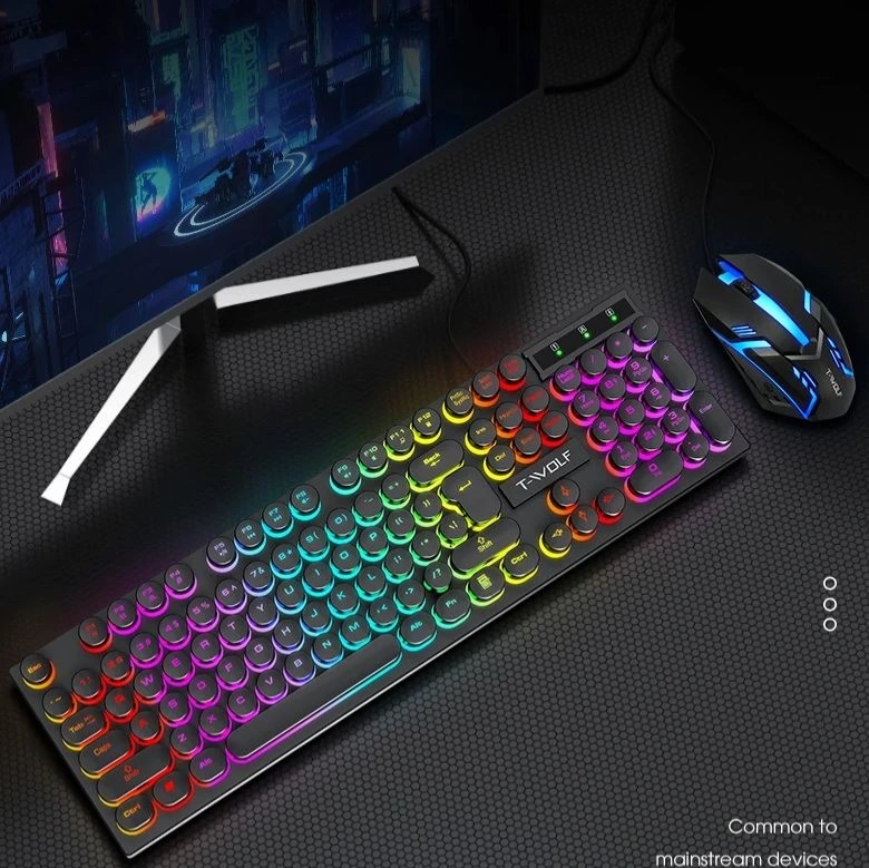 The TWOLF TF270 Retro Punk Backlit Keyboard and Mouse Combo XD21 brings a perfect blend of classic design and modern performance. Featuring vibrant RGB backlighting, it adds a stylish glow to your gaming or workspace setup. The 104 multi-functional keys ensure smooth and responsive typing, while the ergonomic design provides comfort during long gaming or working sessions. The included wired mouse complements the keyboard with precise tracking and customizable lighting effects. Built from durable, high-quality materials, this combo is designed for both gamers and professionals seeking reliability, style, and performance in one complete set.